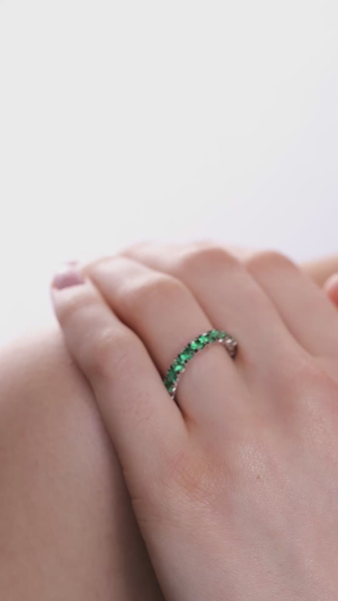 Acest inel clasic inconjoara degetul cu un rand stralucitor de smaralde ce se potriveste perfect oricarei tinute.
